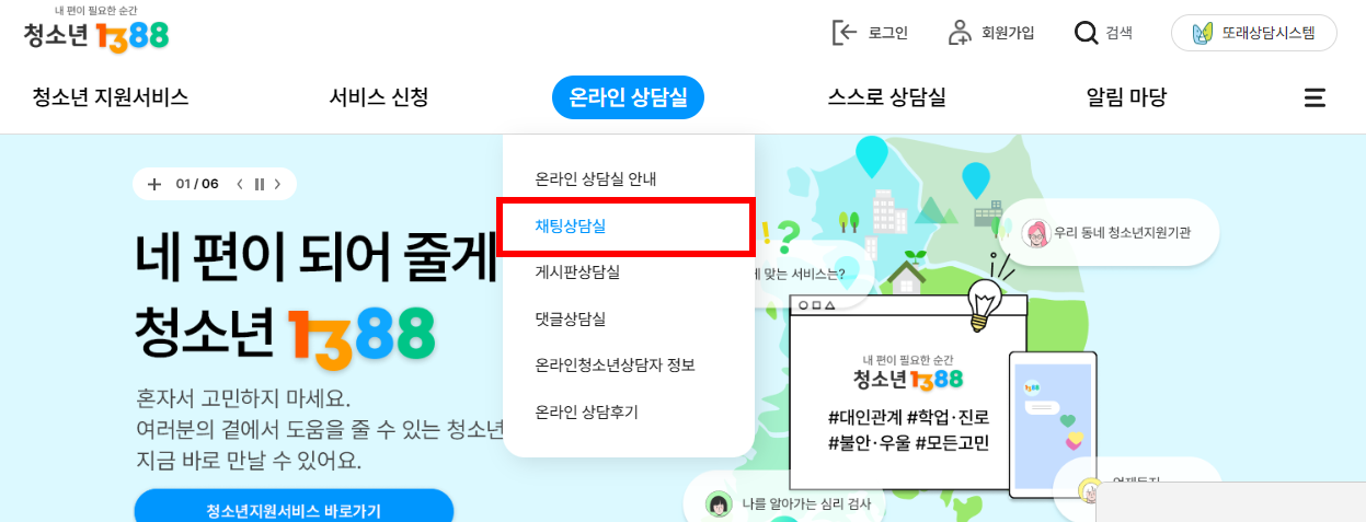 *주의 : 청소년 1388의 경우 회원 가입을 해야만 채팅상담이 가능해요. 상담 신청 전 회원가입은 필수예요!